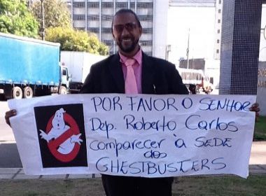Não só a Polícia Federal decidiu fazer graça quando nomeou de Detalhes a operação deflagrada nesta terça-feira (3) e que revelou um esquema de desvio de recursos públicos comandado pelo deputado estadual Roberto Carlos (PDT). Depois de protestar contra declarações do secretário-geral da Fifa, Jérôme Valcke, durante visita às obras da Arena Fonte Nova, Eduardo Alves apareceu novamente. Ele foi até a sede da Polícia Federal durante a tarde para demonstrar sua insatisfação com o caso revelado pela PF. “O Brasil é escola de político corrupto? Toda hora aparece alguma coisa. Estou aqui porque, dificilmente, você vê um civil protestar”, explicou o homem, que se diz empresário. Ele levou um cartaz com referências ao filme Os Caça-Fantasmas (Ghostbusters) para ironizar o fato de o pedetista ser acusado de empregar funcionários fantasmas e desviar para contas de parentes o dinheiro originalmente depositado na conta dos falsos assessores parlamentares. “Por favor, senhor deputado Roberto Carlos, favor comparecer à sede dos Ghestbusters (sic)”, dizia o texto da peça.